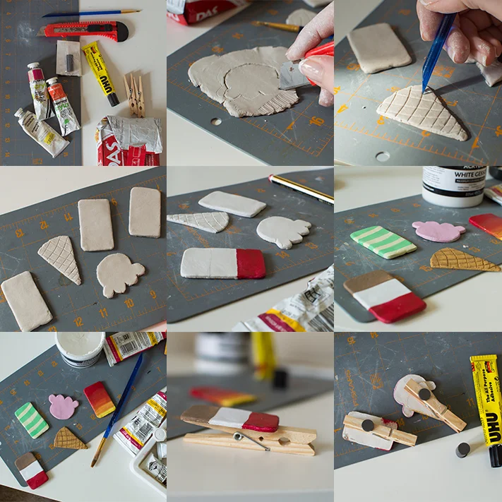 1. Roll out your clay to about a quarter of a cm thick – you don’t want it too heavy or the magnet won’t hold it! Shape it into a lollipop shape, or an ice cream cone, whatever you fancy. Don’t forget to use your peg to measure the size so it’s not too big!